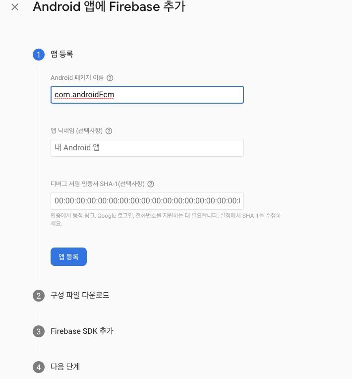 나는 귀찮아서 패키지 이름만 넣었다! 이후 앱 등록 버튼을 클릭한다.