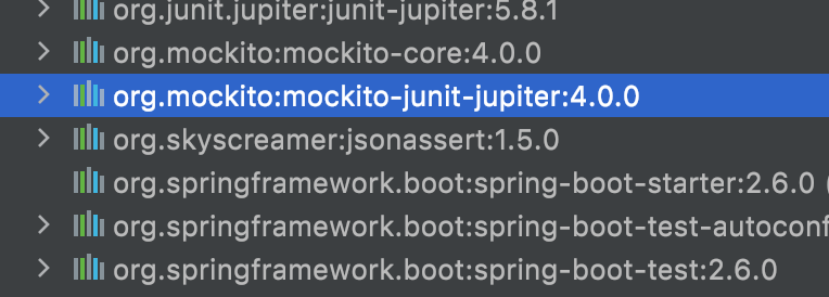 스프링부트 프로젝트를 생성하면 기본적으로 boot-starter에 mockito가 포함되어 있다.
